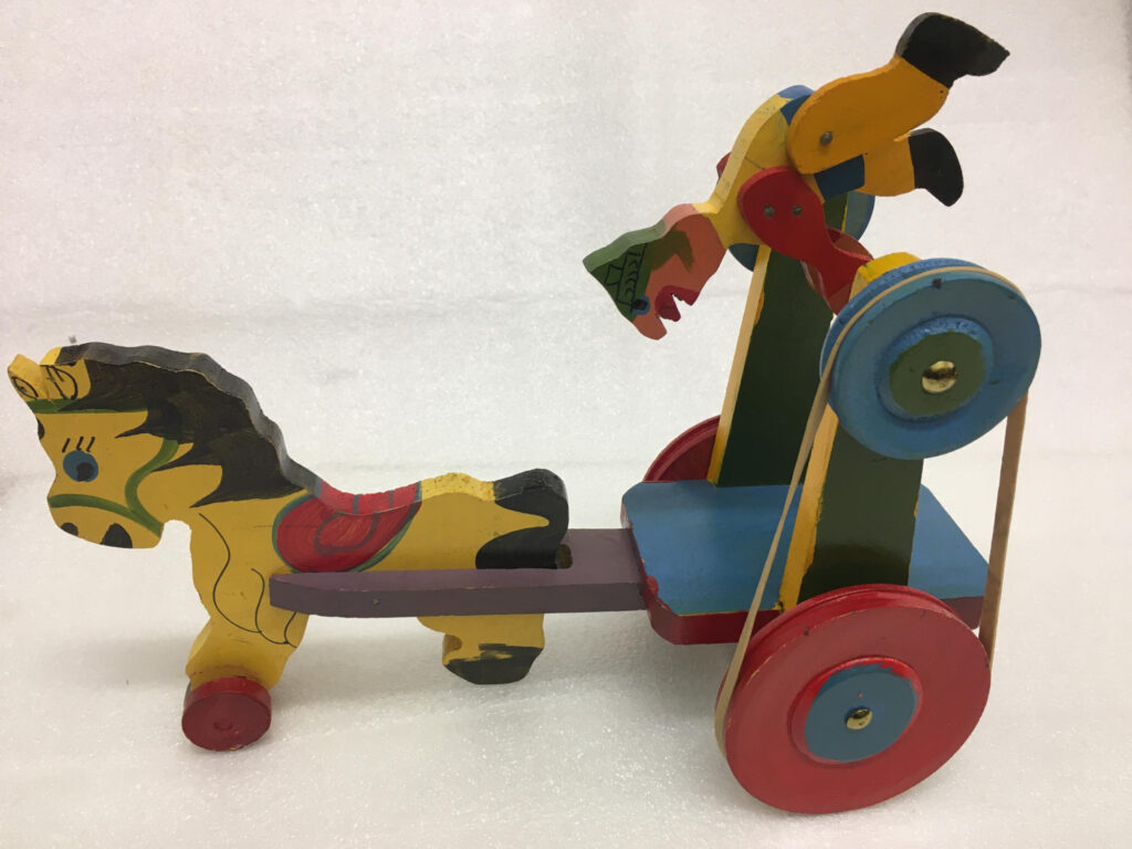 Join us for our current exhibition at Pollock’s Toy Museum, Croydon, celebrating moving toys from around the world. See carved wooden folk toys, and explore how simple mechanisms using string, wire, elastic bands and reused packaging are used to create ingenious and surprising movements.
